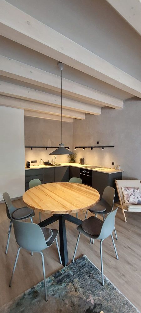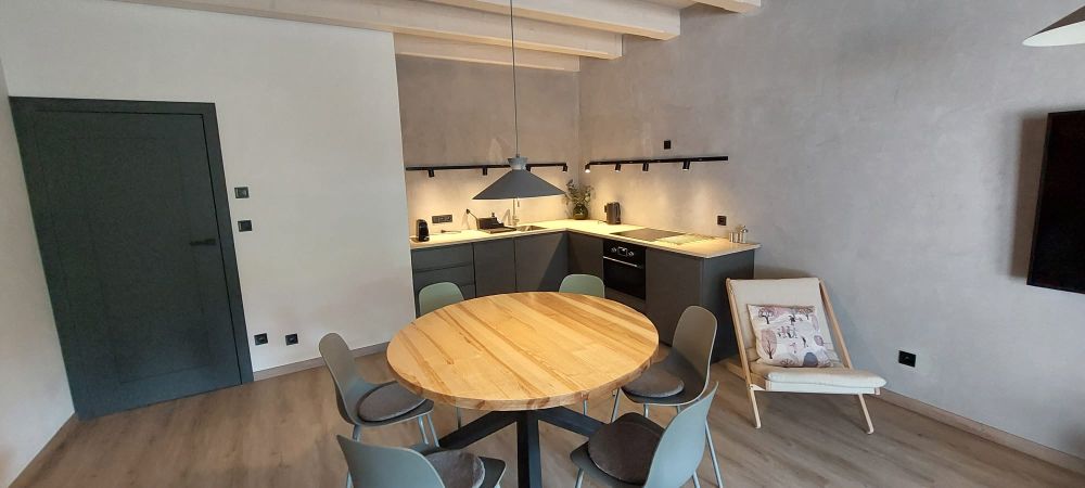 Plně vybavená kuchyň s multifunkční troubou (jejíž součástí je i mikrovlnka), lednicí, varnou konvicí a kávovarem Nespresso. Součástí obývacího pokoje je i jídelna s nástěnnou televizí.