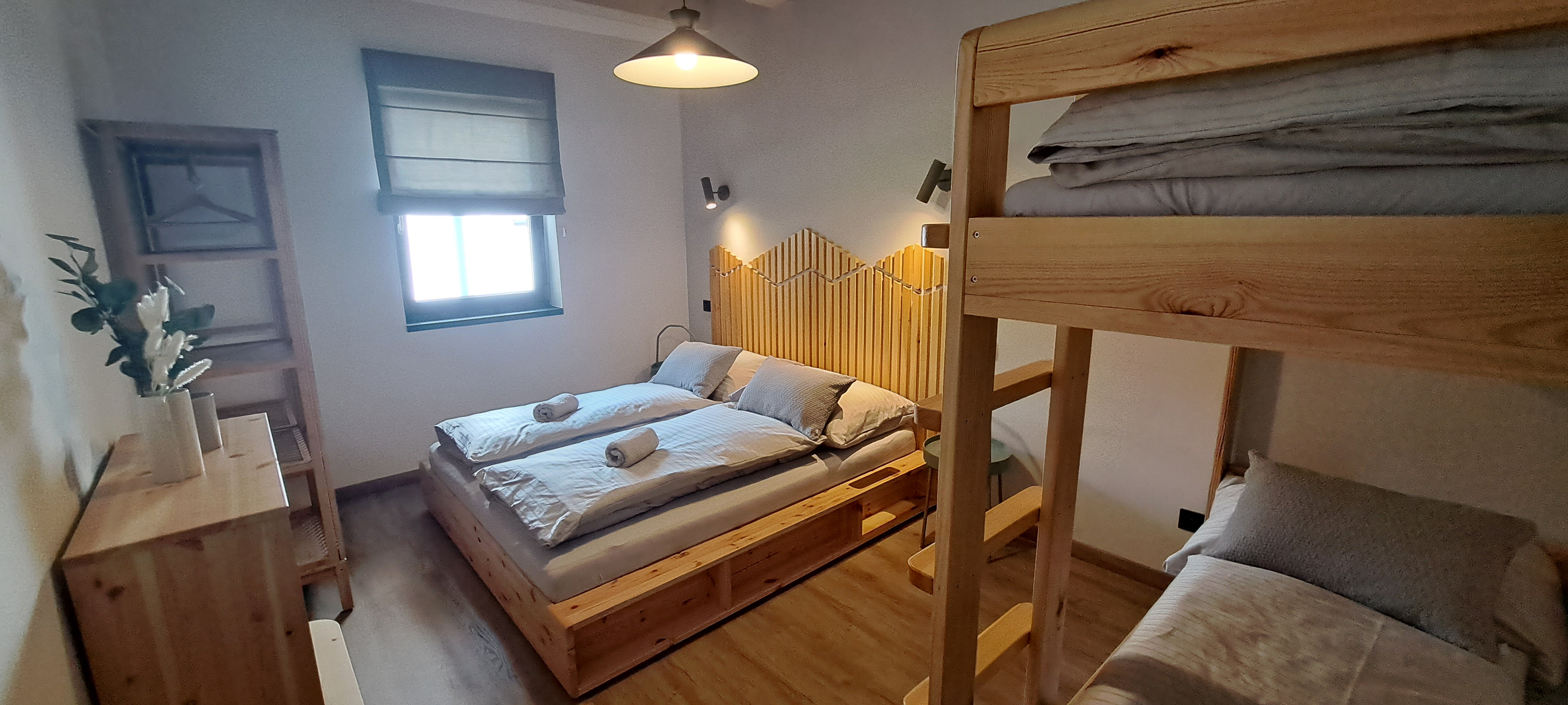 Ložnice má manželskou postel pro 2 osoby + 1x dvoupatrovou postel pro 2 osoby, skříň